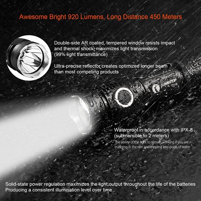LUMINTOP TD16-4 You will be deeply impressed by the comfortable holding feel, and high-end style. It is made of aerospace aluminum alloy with anti-scratching type HAIII military grade hard-anodized finish, which artwork makes it hard to fade or to be scratched. With Attacking head, tactical tail, filter and gun mount, it will be a seriously helpful tool for hunting. Plus it powerful performance, beam distance reaches 450 meters, intensity reaches 10800 CD, and Srobe and flash mode, you will see how fantastic when you using it. And the stainless steel clip brings you great convenience for carry.