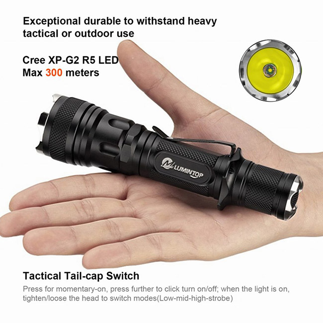 TD12-2 Is made from aerospace aluminum alloy with anti-scratching type HAIII military grade hard-anodized finish, this artwork makes the appreace color is hard to fade, construction sturdy and durable. With beam distance up to 300 meters, intensity 22500 CD, and stobe mode, it is bright enough for you to have outside activites, and seek help in case needing. With stainless steel attacking head & tail bezel, and optional accessories like remote controller, weapon mount and color filteres, it will help you out when facing danger. Besides, it is light and portable, good choice for you take when outside.